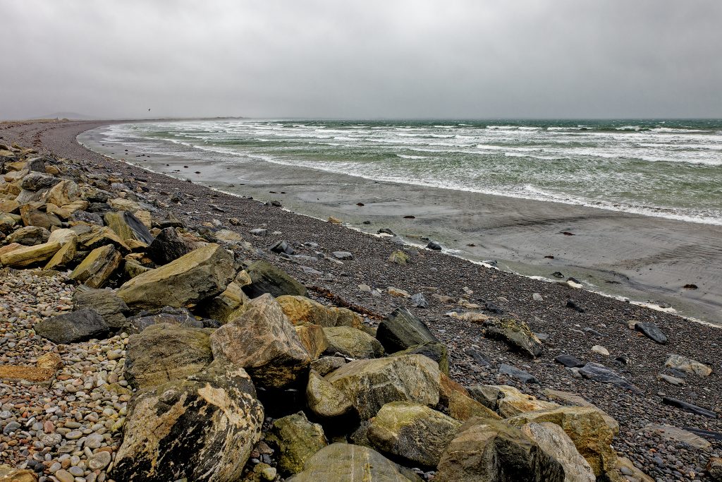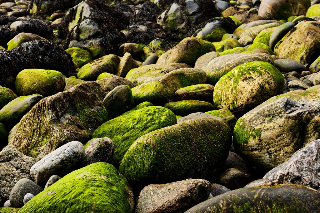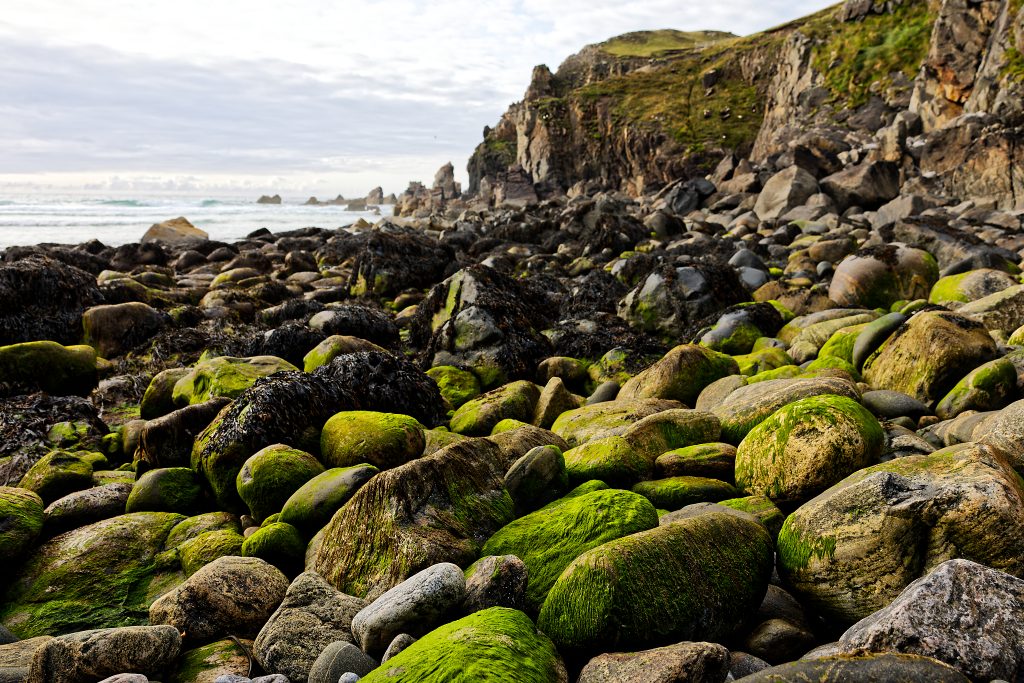 Across the stormy western shores of the island, the pounding waves of the Atlantic have weathered the rocky cliffs into a colourful array of seaweed-covered pebbles, or Molagan in Gaelic